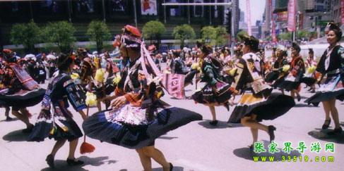亞宜帶領(lǐng)眾人迎敵,戰(zhàn)斗了三天三夜,終因寡不敵眾向西撤退,得到貴州苗族支持,同官家周旋了一年。第二年四月八亞宜和貴州英雄亞努等人戰(zhàn)死在貴陽(yáng)城。從那時(shí)起,“四月八”就成了青年男女聯(lián)歡節(jié)和祭祀英雄的紀(jì)念日。盡管歷代統(tǒng)治階級(jí)都以各種借口加以禁止,而具有反抗精神的苗族人民,只是改變了跳花的形式,仍然保留著聚會(huì)對(duì)歌內(nèi)容。一年一次,世代相傳,知道民國(guó)時(shí)期各地才先后中斷。后于一九八一年國(guó)家民委批示統(tǒng)一在京的苗族過“四月八”而才得到恢復(fù)。一九八六年在鳳凰上下落朝井鄉(xiāng)龍?zhí)梁哟澹?ldquo;四月八”的發(fā)源地舉行隆重聚會(huì)。這一天啟明星才掛在樹尖尖上的時(shí)候,湘黔邊境各地的男女青年,身著節(jié)日的盛裝,踏著路邊毛草上的露珠,唱著歌,吹著木葉,嘻嘻哈哈,迎著燦爛的朝露,從各條彎彎的山道上,向“跳花溝”涌來。十嶺八坡,山溝里外,龍河兩岸都站滿了人,熙熙攘攘,熱鬧非凡。會(huì)場(chǎng)的正中掛有寬六尺長(zhǎng)七尺的淺紅大旗,繡有“四月八”三個(gè)大字,兩邊龍鳳圖案,莊嚴(yán)古樸,表示歷史悠久和不忘祖先功德。