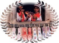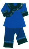 邊。男捆腰帶,女套繡花圍裙。頭上均包青布帕或絲帕,男帕左方垂一節(jié)過耳,婦女全包頭。未婚閨女留長發(fā)扎辮,用紅頭繩扎上下兩端,額前前留“劉海”。已婚婦女挽上發(fā)管,別簪,插銀首飾。褲子多為青、藍色、上結白布褲腰,褲腳短且大。青壯年男子打綁腿,女褲以對襯色布加邊,上綴三條均等的梅花條,腳上穿青布瓦鞋,包白色裹腳布。若遇喜慶節(jié)日或走親訪友,則另有一番梳妝打扮,如加佩牙簽、銀牌等。