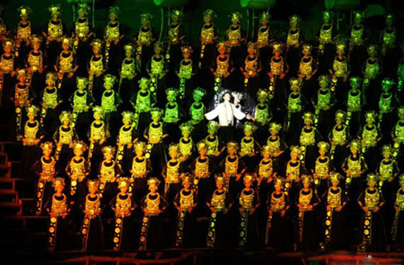 以此基礎進行了藝術再創(chuàng)造,悲傷、歡樂、笑容、淚水交合成一個曲折動人的故事。整場演出體現(xiàn)人物細節(jié),以個性化的敘事結構給人以親近感和頭尾呼應的完整感。汲取世界豐富的音樂文化元素和表現(xiàn)形式,輔之以現(xiàn)代高科技的舞臺特效技術,對世界音樂歌舞劇的一次成功的創(chuàng)新,成為中國山水實景演出的劃時代巨獻。