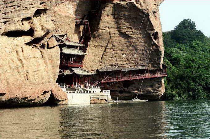 水巖在旱仙巖北面,靠上清河兩岸,因臨水而名,以碧水丹山而聞名遐邇,主體在西岸。要主景點(diǎn)有古棧道遺址、飛云閣、棋盤(pán)石、“仙女獻(xiàn)花”、仙梳石、金鐘峰、仙勺石、雌雄石等。怪石奇巖,滿山紛陳,隨處是景,目不暇接。從龍虎山莊附近乘船行不遠(yuǎn),對(duì)岸即是水巖,只見(jiàn)崖壁貼岸,陡立如屏,古樹(shù)橫生,藤蔓垂掛,山崖上古棧道遺址依然存在。在崖壁上有許多名人題刻,如“玉壁凌空”、“半天仙跡”、“神仙可接”等。至一峽口上岸,左側(cè)即絕壁獨(dú)立的“仙女獻(xiàn)花”。沿山徑上山,一路美景不斷。對(duì)岸亦是高峰聳立河邊,上清河蜿蜒中間,青山碧水,幽景迷人。