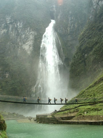瀑水從斧削狀絕壁上的溶洞奪口噴出,飛流直下,聲如霹靂,數(shù)里可聞,整個山谷煙云彌漫,霧氣蒙蒙,遠看瀑布如白練懸空,近看似銀河瀉天際。每當(dāng)陽光照耀時,五光十色的浪花似彩虹凌空飛舞,艷麗奪目,蔚為壯觀。瀑高214m,建有一電站。
