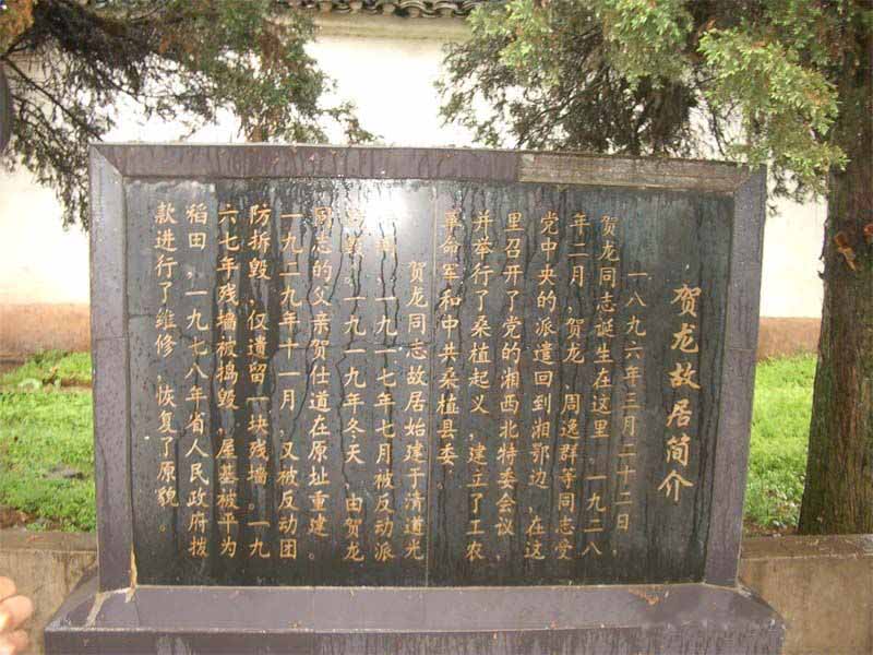 為了紀念偉大的革命元帥。1977年省縣兩級政府撥款,賀龍故居按舊居原貌修復的。賀龍紀念館于1996年3月25日賀龍誕辰100周年之際竣工落成,大門上首的墨色大理石匾額上,是江澤民親筆題寫的“賀龍紀念館”幾個燙金大字。。賀龍紀念館與賀龍故居、賀龍橋成犄角之勢。