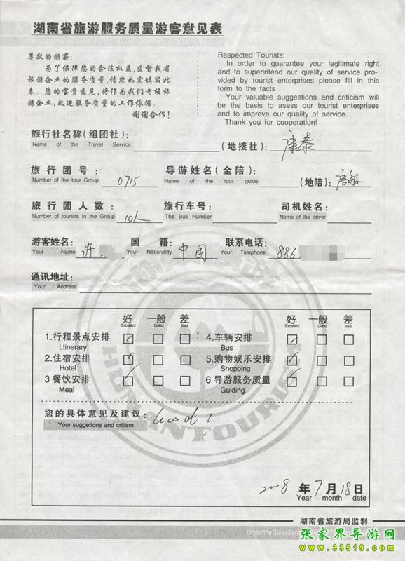 - 7月5日杭州沈先生一行18人質(zhì)量反饋單