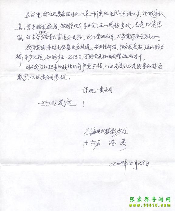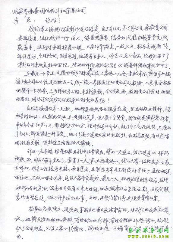 2009年5月19日“上海現(xiàn)代攝影沙龍”一行16人,參加張家界旅游導(dǎo)游網(wǎng)組織的張家界旅游跟團(tuán),于2009年5月25日結(jié)束行程。游玩期間,由于導(dǎo)游楊蓓的出色講解和周到的服務(wù),得到客人的一致好評(píng)。客人特寄表揚(yáng)信一封,如下: