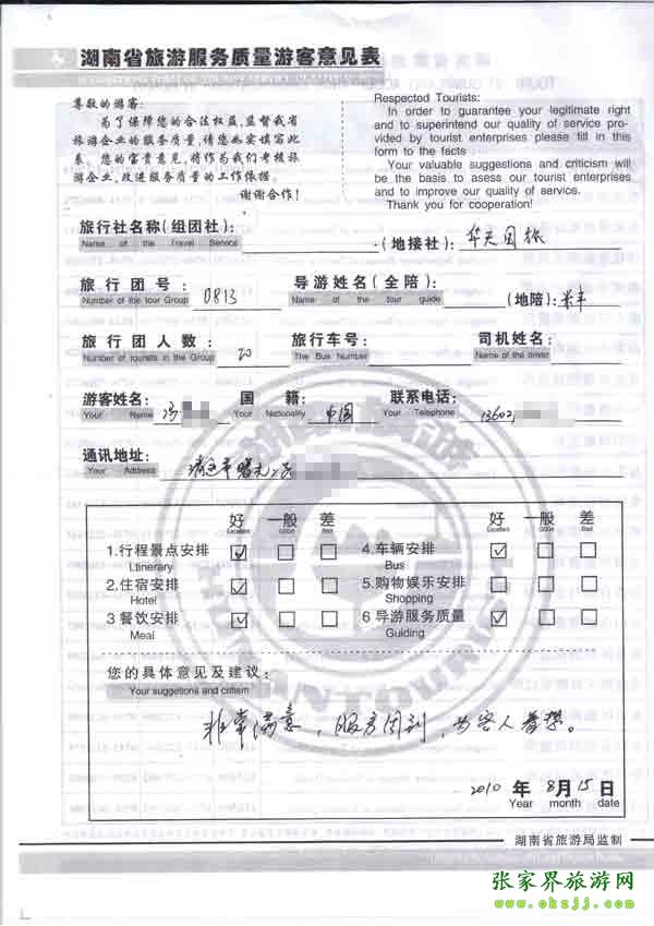 2010年8月15日清遠馮先生一行20位旅游質(zhì)量反饋:非常滿意,服務周到,為人著想