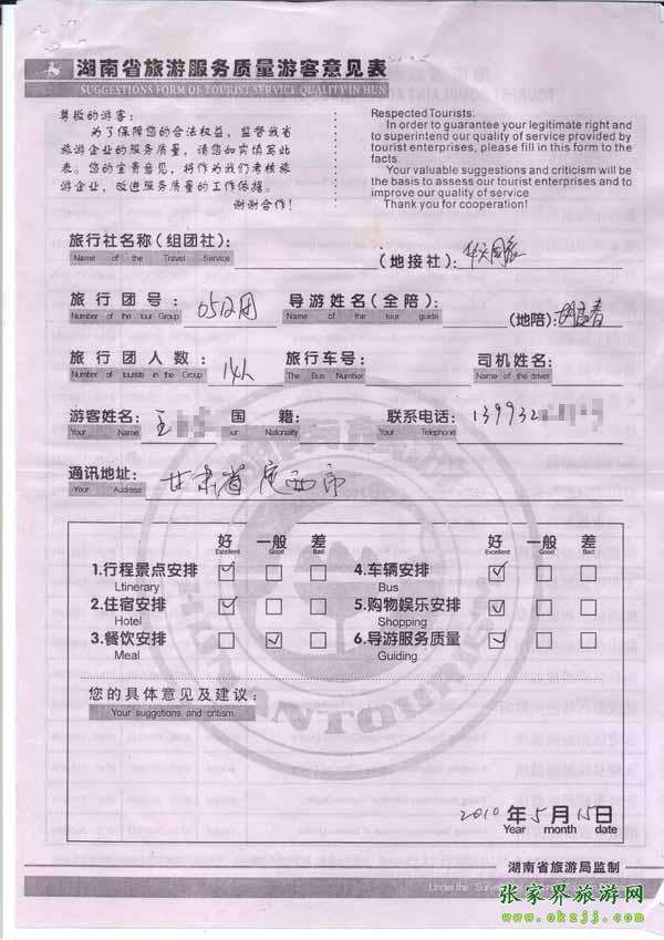 2010年5月15日甘肅王小姐一行14位旅游質量反饋