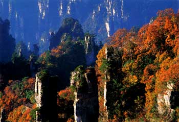 森林覆蓋率達(dá)97.7%的張家界,無(wú)愧于中國(guó)第一個(gè)國(guó)家森林公園的稱(chēng)號(hào)。其植物種類(lèi)比整個(gè)歐洲擁有的樹(shù)木種類(lèi)多一倍以上。珍貴樹(shù)種包括屬?lài)?guó)家一級(jí)保護(hù)的珙桐(外國(guó)人又叫“中國(guó)的鴿子花”)和屬?lài)?guó)家二級(jí)、三級(jí)保護(hù)的鐘萼木、銀杏、香果樹(shù)以及鵝掌楸、香葉楠、杜仲、金錢(qián)柳、貓兒屎(第三紀(jì)殘遺樹(shù)種)、銀鵲、南方紅豆杉等,是個(gè)實(shí)實(shí)在在的森林寶庫(kù)。 冬天走在這樣的森林寶庫(kù)里,滿眼的綠帶給你的卻是春天般的溫暖。精靈奇巧的霧凇千姿百態(tài),笨拙憨厚的灌木清純天成……踏著片片落葉,遙望遠(yuǎn)峰勁綠,深呼吸一口初冬微涼的空氣,春、秋、冬三季在這一刻蒙太奇般地拼在了一起,夢(mèng)幻般的感覺(jué)縈繞不去。 好山好水不冬眠