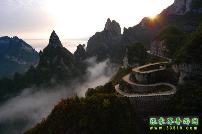 通天大道與天門山索道、天門洞開(kāi)、空中花園并稱天門山四大奇觀,它共有九十九道灣,在索道上俯看如巨龍騰起,如玉帶盤纏,直通天際,使人為之震撼,堪稱天下第一公路奇觀。由此可直抵天門洞下天梯前。