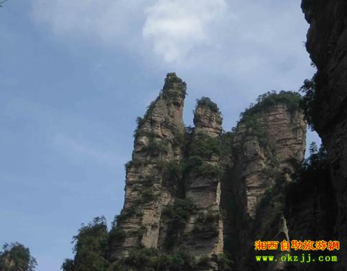 什么?有人說夫妻巖是兩個石頭啦。那旁邊的那個石頭是第三者?我暈,佩服你們的想象力啊。夫妻巖位于黃石寨對面山頭,張家界山莊后,在田家臺的對面,有兩個自然生成的山峰。這山也真奇,一個象男,一個象女,頭挨著頭,身靠著身,有眼睛,有鼻子,有頭發(fā),有嘴唇,就連眉毛與牙齒,也看得清清楚楚,明明白白。他倆站在高山,立在神地,相親相愛,永不分離。相傳,這是花仙山荷花與養(yǎng)蜂人田花郎歷盡千辛萬苦,幾度起死回生結(jié)合而成的,如遇自己的紅顏知己,可以去此處看看,許下心愿可保夫妻和睦,家庭幸福。